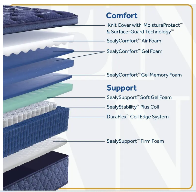 - SealyComfort™ Foam (Quilt): A high-quality, responsive foam with varying comfort levels, including soft and gel-infused.